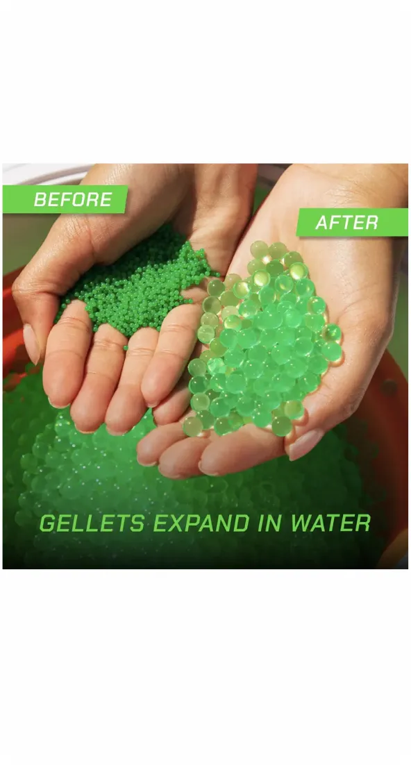 Gellets® are the fun & unique ammo used in all our blasters. They're colorful & squishy water-based gel beads that burst on impact! Gellets are made out of Super Absorbent Polymer (SAP), an all natural, non-toxic, non-irritating, starch-based material. Gellets burst on contact and immediately begin to evaporate, leaving No Stain...No Residue...No Mess!