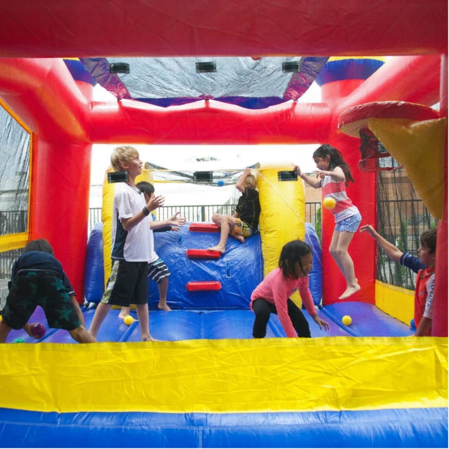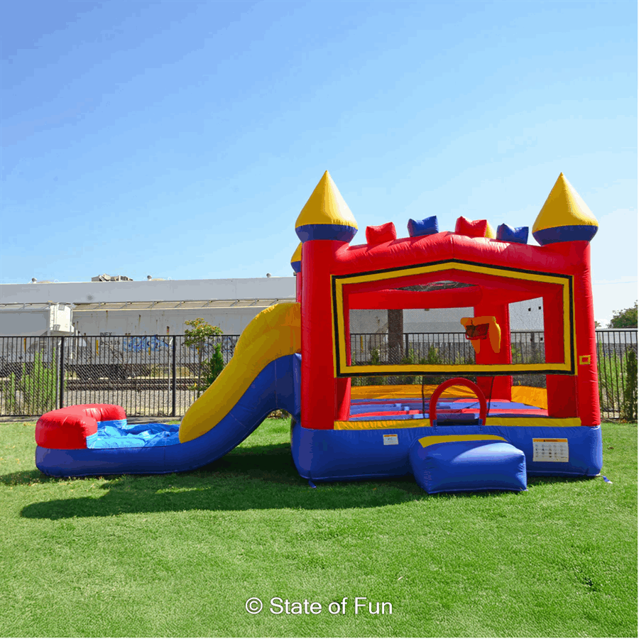Kids can bounce around in the spacious jumping area before climbing the built-in rock wall and racing down the attached water slide into the refreshing splash pool below. With bright royal colors and castle towers, this inflatable quickly becomes the highlight attraction at any event.