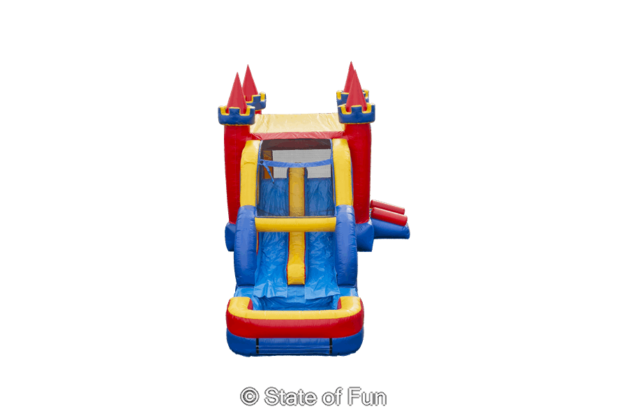 - 5-in-1 design: bouncer, basketball hoop, climbing area, double lane slide, splash pool.