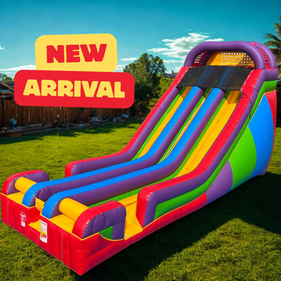 Get ready for the ultimate racing experience with our 22' Wacky Double Lane Slide! This towering inflatable is a showstopper, standing at a massive 22 feet tall and featuring vibrant, "wacky" colors that will grab everyone's attention. Whether it’s a school carnival, a large backyard bash, or a corporate event, this slide is designed to handle the crowd and keep the energy high. 🏃♂️💨