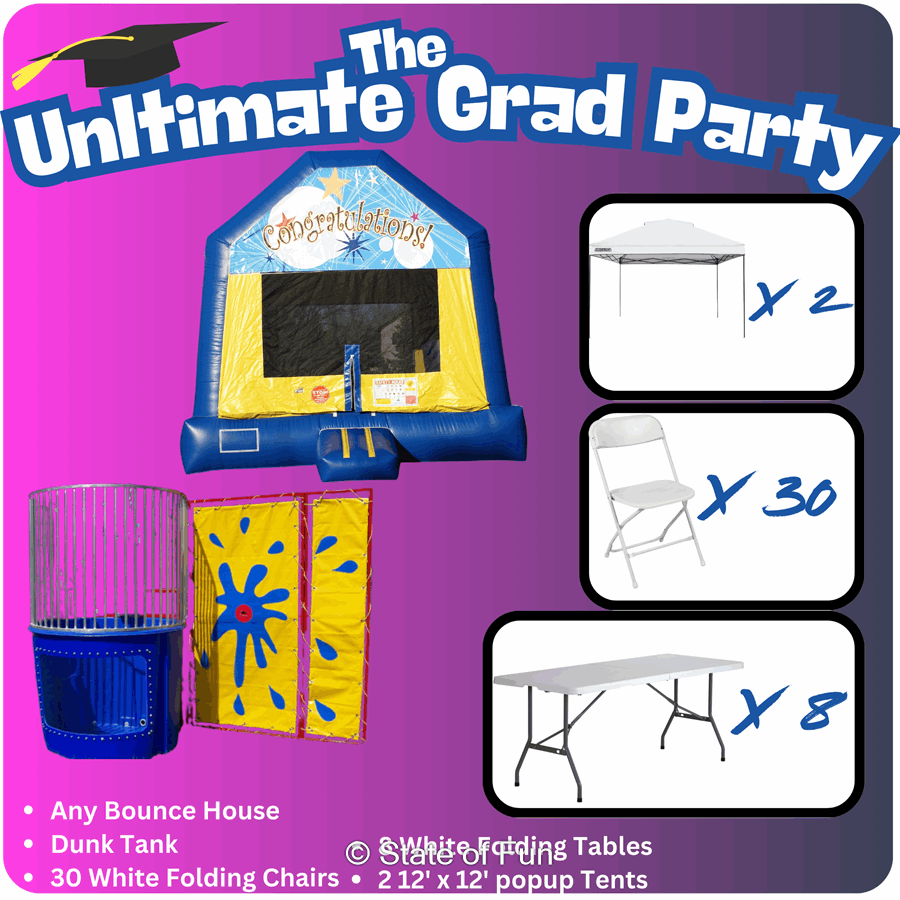 Plan a memorable, stress-free graduation celebration with The Ultimate Graduation Party package. This graduation party package combines essential party rentals—seating, tables, games, a banner moonwalk, and tents—so you can focus on the graduate. Fast setup. Durable equipment. Fun guaranteed.